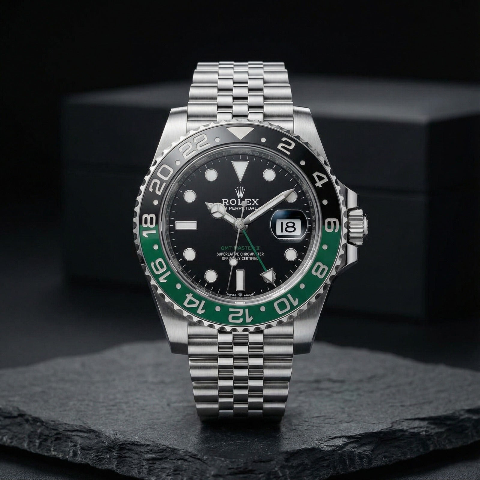 Break away from the ordinary with this stunning interpretation of the GMT-Master II. Featuring a unique Black and Green ceramic bezel, this timepiece offers a fresh and contemporary look that stands out immediately. Paired with the luxurious Jubilee bracelet, it is the perfect balance of sporty durability and high-end elegance.