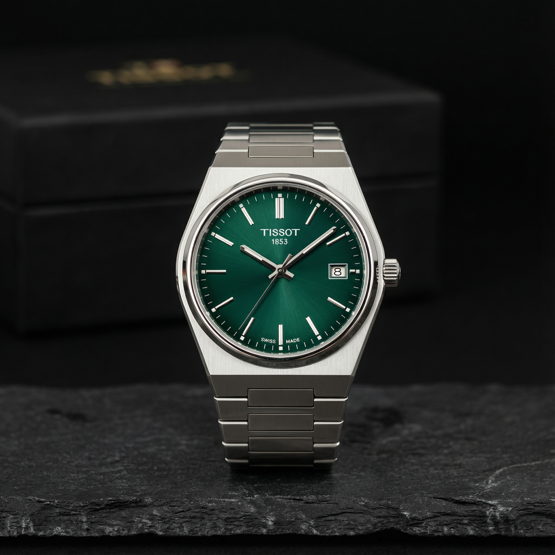 A sleek revival of a 1970s icon, this Tissot PRX features a stunning integrated steel bracelet and a vibrant emerald green dial.